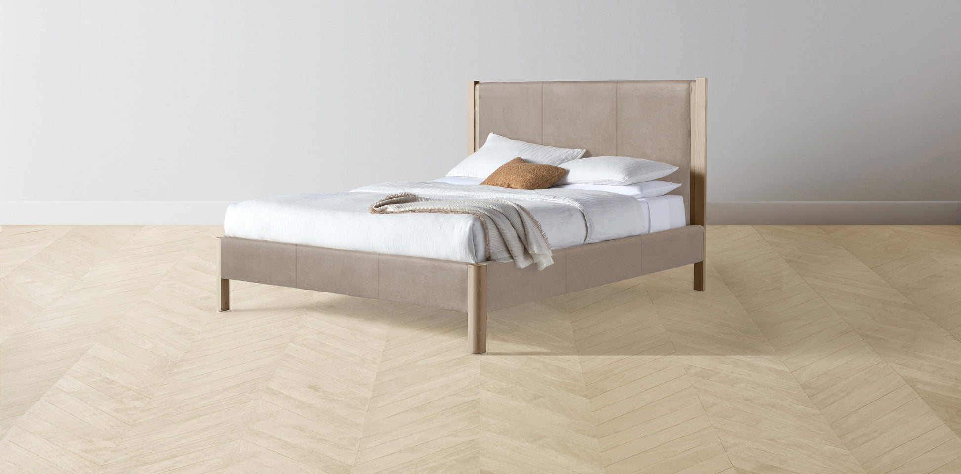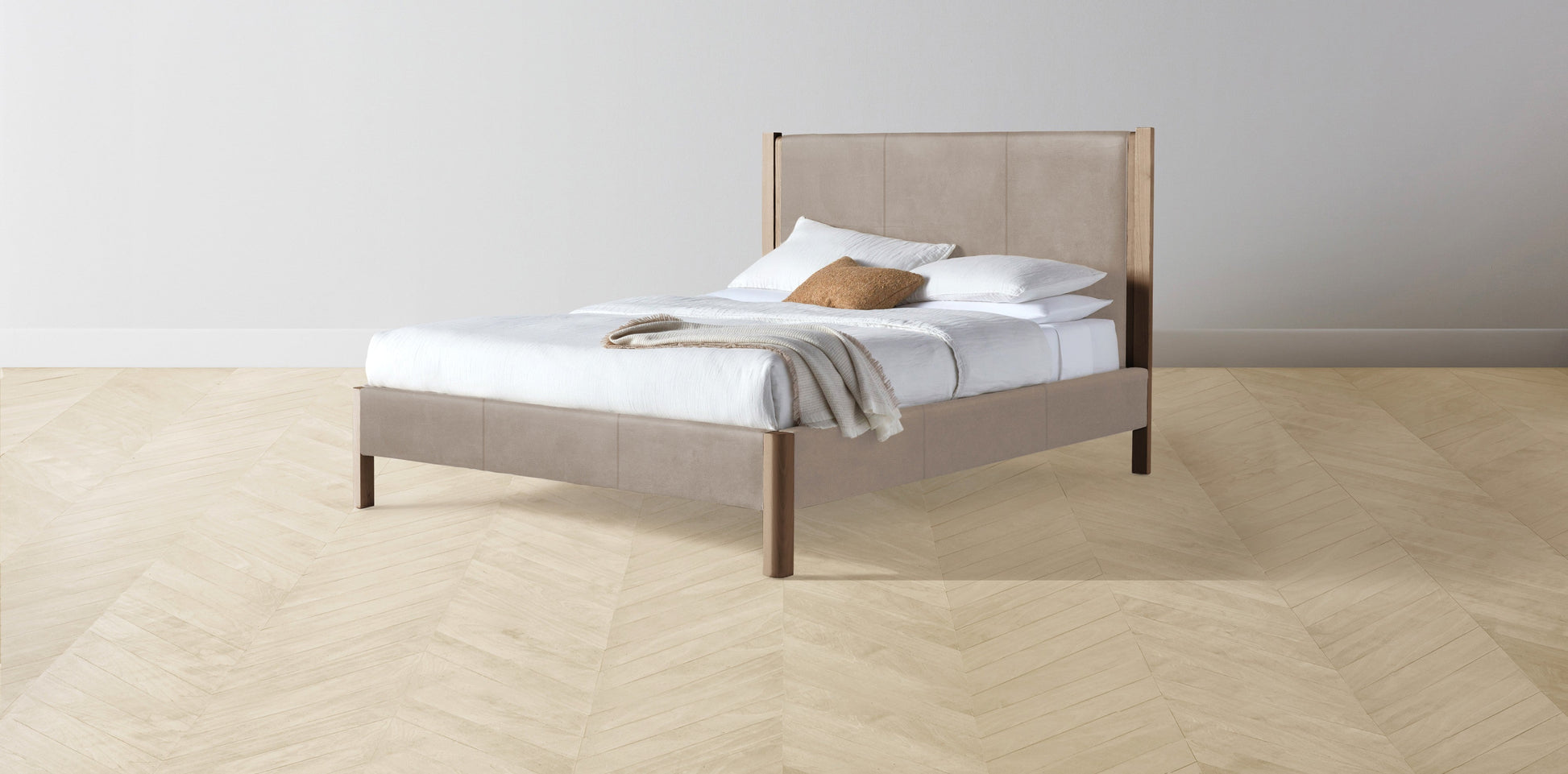 The Thompson - Nubuck Leather Fawn Bed - 48" Headboard - Upholstered on reverse
